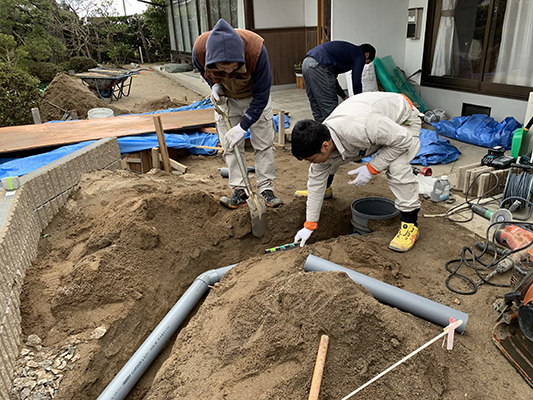 雨水を集める場所には溜枡を設置して、配管には必要な勾配をとりながら掘り進めて設置・接続していきます。また、庭部分には水栓&洗場も設けるためその給排水も併せて設置していきます🔨