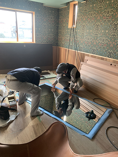 部屋の中に鏡を取り付けています。鏡を部屋の中に取り付けることで部屋が広く・奥行きがあるように見える効果を得ることができます✨