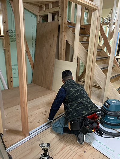 木製の建具枠を取り付けています。木製枠は木の癖やゆがみもあるため癖や反りを見ながらとりつける位置や木材を微調整していきます🔨