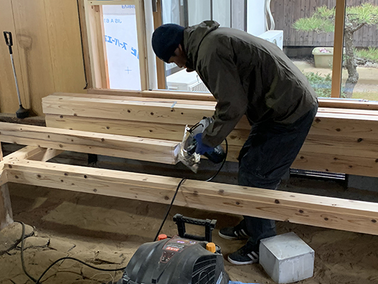 既設の床を再築しています。床高さの基準レベルを出し、それに併せて大引きをとりつけます🔨必要な長さ寸法などを測り加工を施して取付けます。
