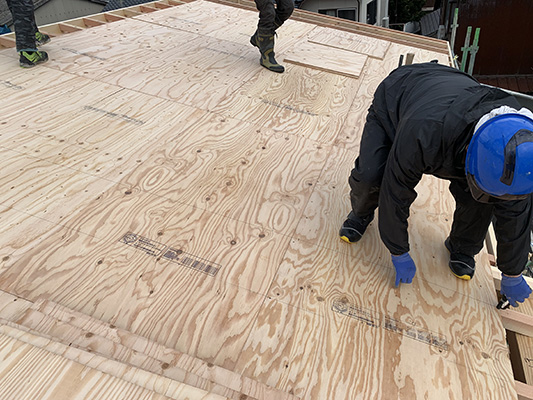 垂木、鼻隠し、破風板と順に取り付けていったあとは構造用合板を屋根面に打ち付けていき、防水用のルーフィングを取り付けておけば一先ず安心です👌