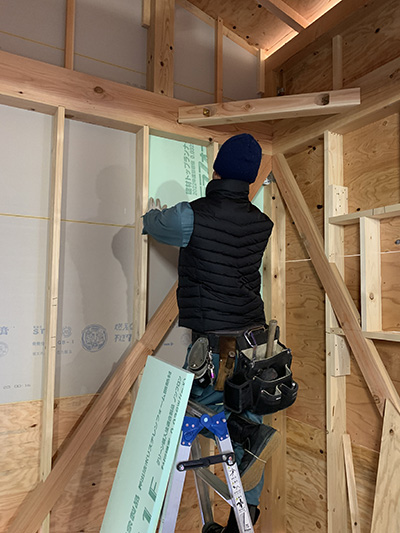 建物の内部、壁や天井などに断熱材を切り込んで入れていきます🔨