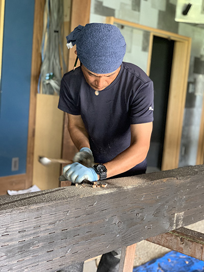 飾りとして使用する柱を加工しています🔨味を出すために普段はやらない、木材を痛める作業を行います。どんな風になったかは後日のお楽しみです✨